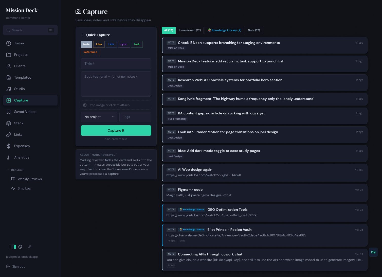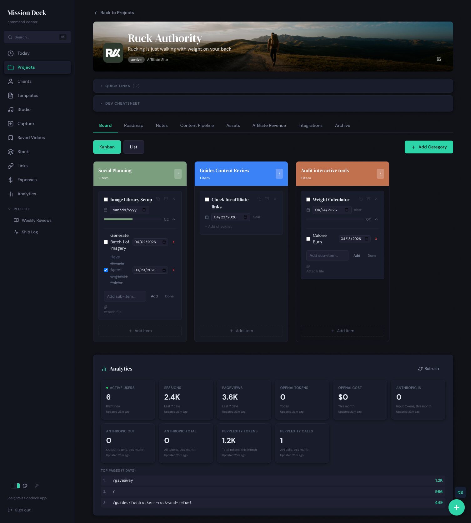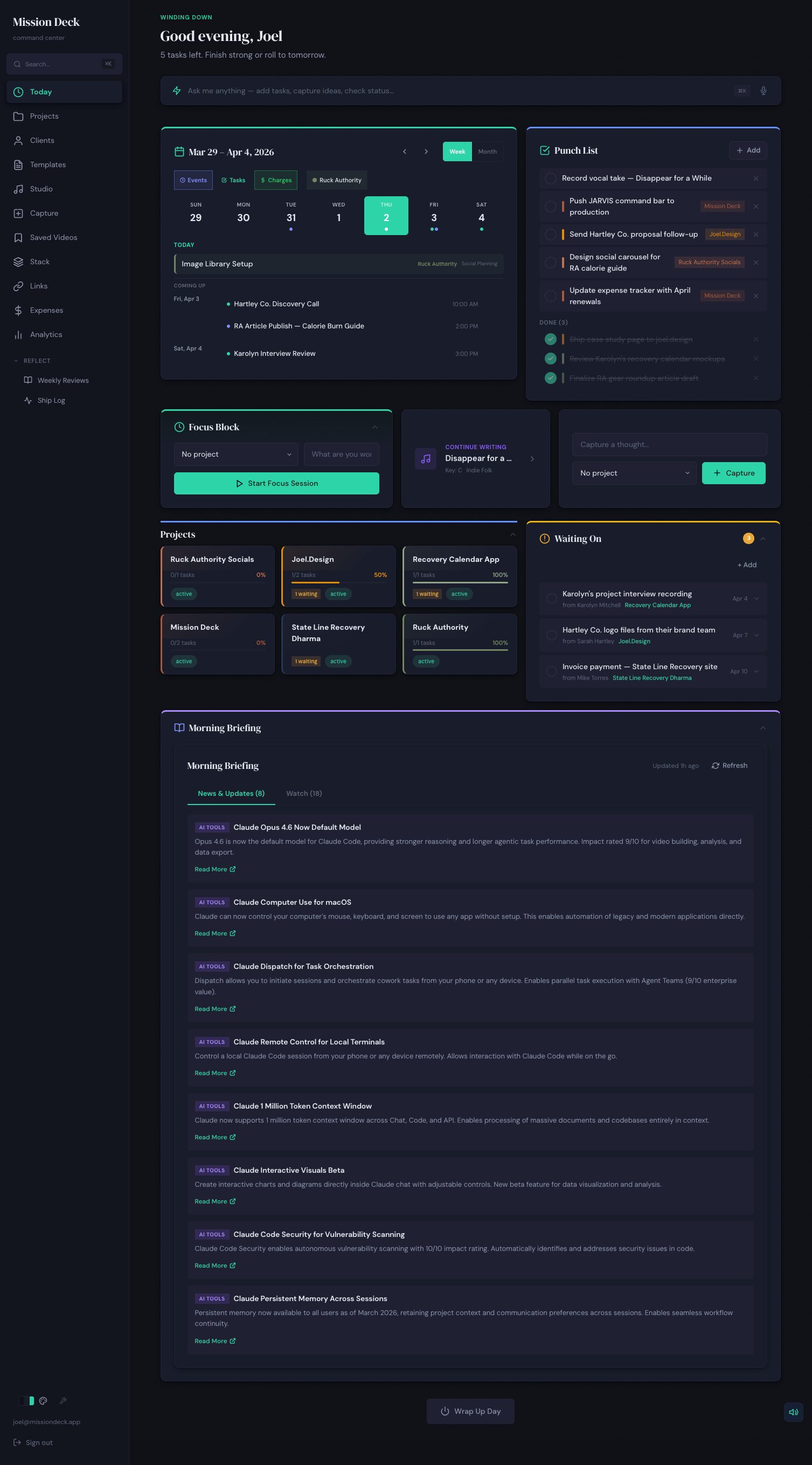 The typical freelance setup: a project manager here, a CRM somewhere else, invoices in a third app, analytics spread across three dashboards, notes in Notion. Each tool is fine on its own. Together they require constant manual translation - and the cost isn't just the subscriptions, it's the context-switching. Starting a work session means opening eight tabs, doing mental math to connect information that should just be connected. Mission Deck started as an experiment: what if one system knew everything? It's now the tool the entire practice runs out of - and the most thorough proof of what one person can build.