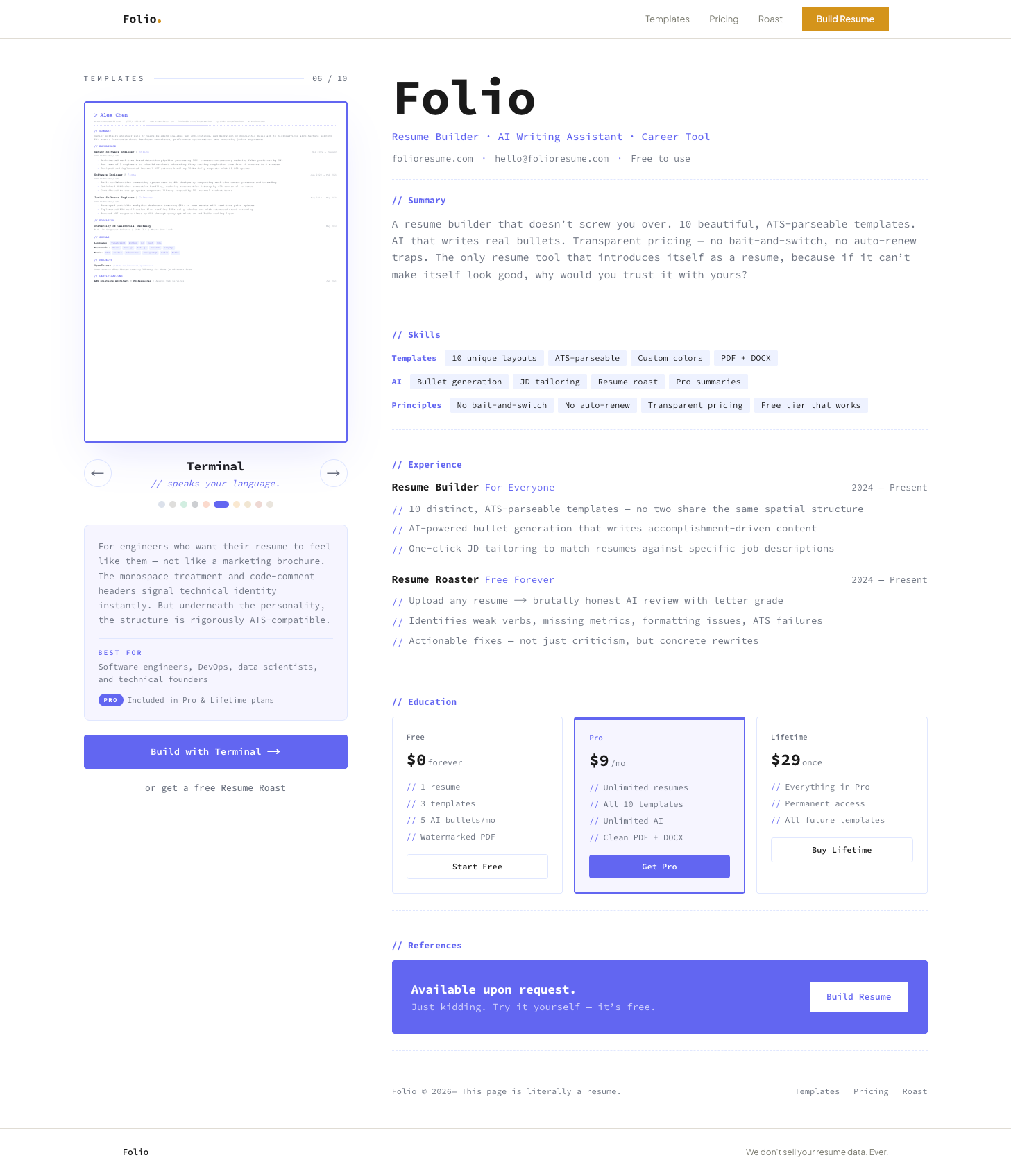 This tool doesn't just help you build a resume. It proves it can make any resume beautiful. The landing page IS the resume. The product demonstrates itself. No marketing theatre. No stock photography. Just proof.