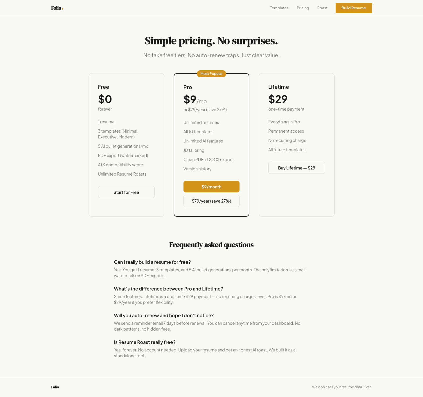 "Most resume builders charge you $10/month for features that shouldn't cost anything. We're different."