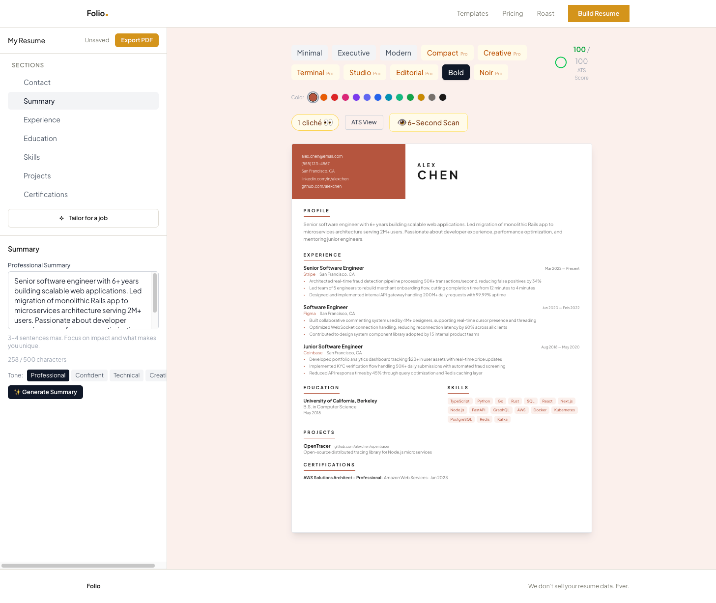 AI-generated bullets that match job descriptions, one-click JD tailoring, Resume Roaster (a brutally honest AI review with letter grades), plus PDF and DOCX export with clean formatting